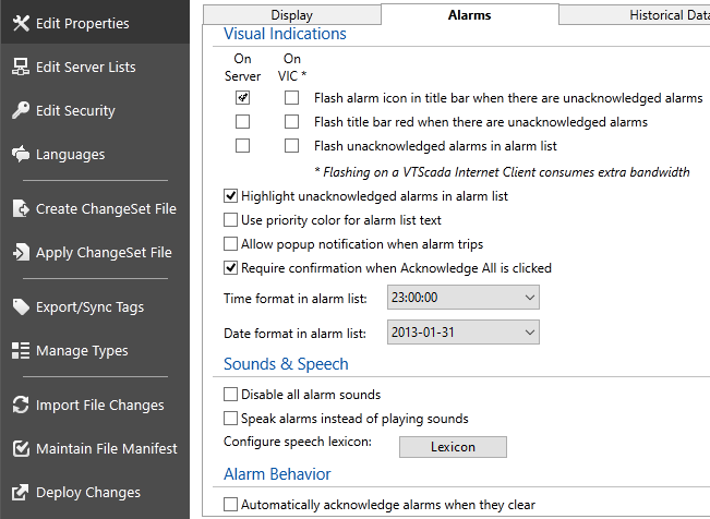 In the Alarms tab of the Edit Properties page of the VTScada Application Configuration dialog, you can find the most commonly adjusted properties. Many more are available in the Advanced view of the Edit Properties page. Refer to: Alarm Properties and Alarm Notification System Properties.
