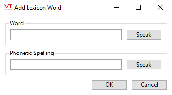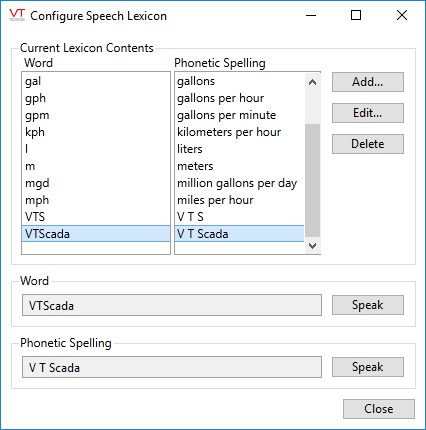 Use the Speech Lexicon dialog to adjust how words are pronounced when spoken by voice engine. If using a third party speech engine that provides its own lexicon configuration, disable the VTScada Speech Lexicon by changing the value of the property, EnableLexiconDialog to 0.