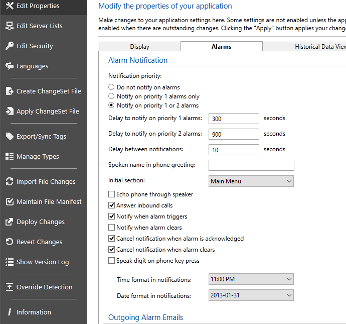 The Alarm Notifications section of the Alarms tab in the Edit Properties dialog is used to set the conditions under which your application's Alarm Notification System will contact registered operators.