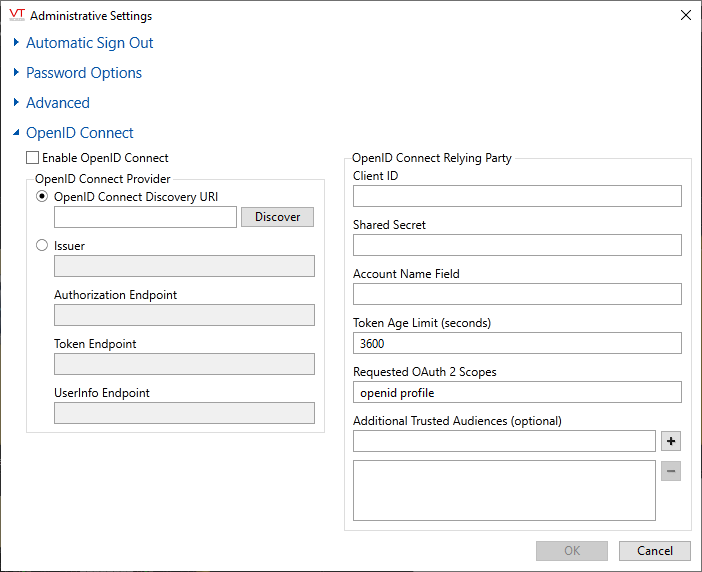 You can choose to allow connections using OpenID Connect, standard VTScada username and password connections, or both.