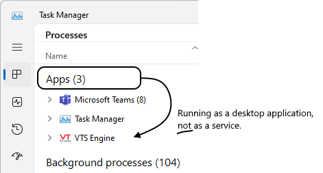 If VTS doesn't show in any list, it is not running on this workstation. The Task Manager won't tell you what is running on remote servers. In this case, if you can see your application, you must be using a Thin Client, and from here you have no way to know whether the server is running in desktop or service mode.
