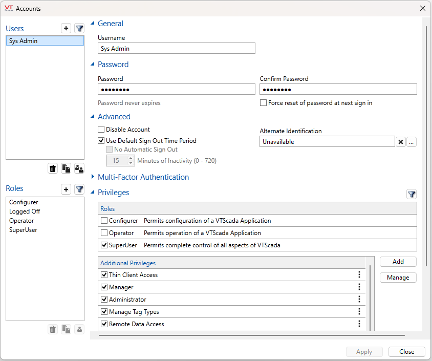 Use the Accounts dialog to create and manage all accounts and roles. Your account must have the Manager privilege. The following instructions are for creating an account, but apply identically to creating a role, excepting that roles do not have passwords, alternate identification or automatic sign off periods.