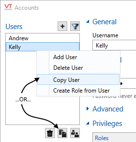 - Right-click on the account to copy and from the menu, select "Create Role From User" or, select the account then click the Copy button at the bottom of the list.