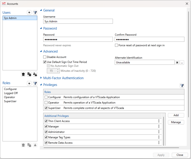 When security is enabled, everyone who uses the application must have an account. The account is used to identify and authenticate the user, hold the list of granted privileges, and store features that are unique to the user such as a custom automatic sign out period.
