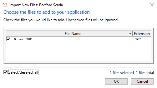- VTScada will scan for new files in your application folder and prompt you to confirm which ones you want to import (put under version control). Not all file types are included. For example, .BAK files are ignored.