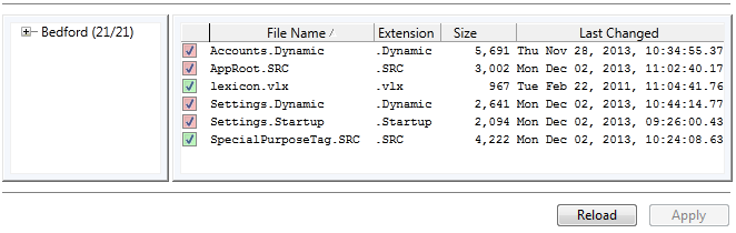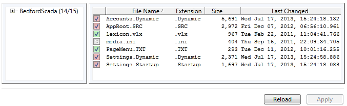 The File Manifest, a page of the Application Configuration dialog, lists those user files that are monitored and maintained by the VTScada version control system. You may add files to the list if you want to distribute them with the application and maintain them under change-control. You may also remove certain files from the list, although in the case of the VTScada-created files this is not advised. Files that you can remove are marked with green. VTScada files that you cannot remove from version control are indicated by red check boxes.