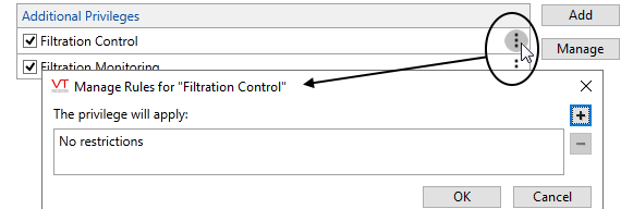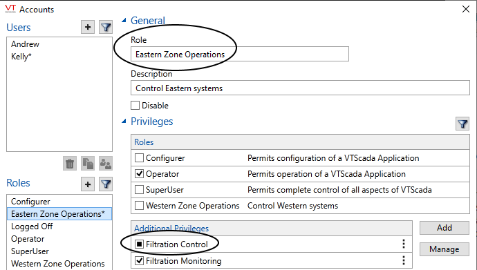 The example in the previous figure shows an example "Eastern Zone Operations" role. The role contains two custom privileges, Filtration Control and Filtration Monitoring. Filtration control is meant to be applied to I/O tags and is therefore limited by a scope rule to tags in the Eastern Zone context. (Examples follow, showing how the rule is applied.) The custom privilege, Filtration Monitoring, is meant to be applied to pages and therefore is not limited by a tag-scope rule.