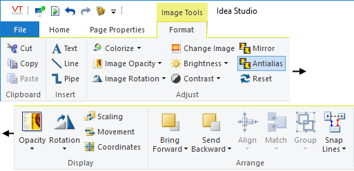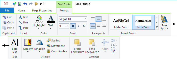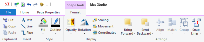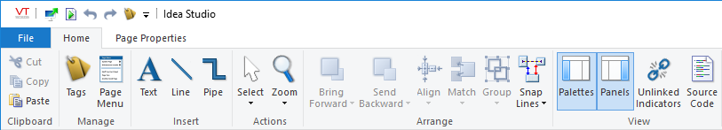 Many of the object creation, formatting and alignment tools, available to the Idea Studio, are stored in ribbons across the top of the page. Several ribbons exist, but only the Home ribbon will be visible at all times. Other ribbons contain properties or formatting tools and will be visible only you have selected objects of a given type.