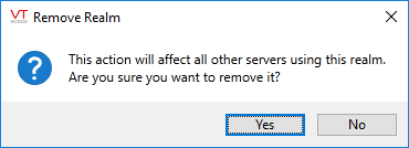 In the case that you have more than one Thin Client Server, the realm will be removed from all. Any users who are connected to the realm will be disconnected immediately.