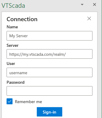 The use of a secured connection (X.509 certificate) is mandatory. The VTScada Excel add-in will not connect to an unsecured server.