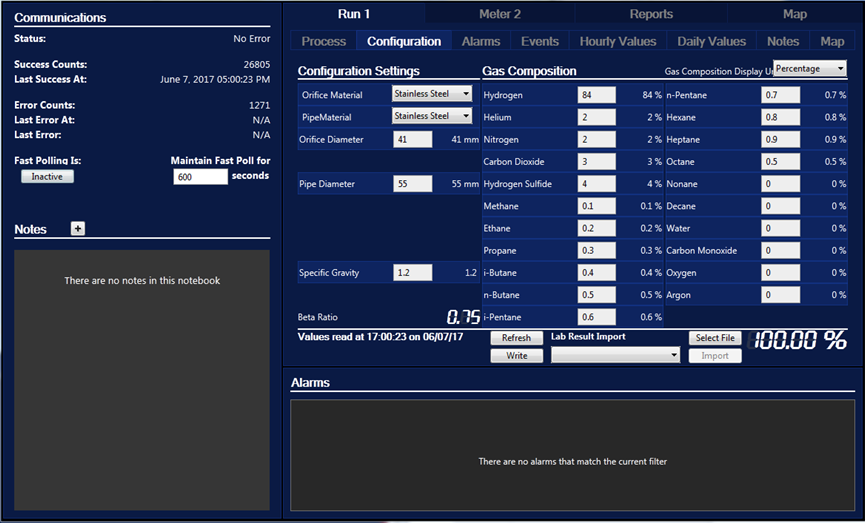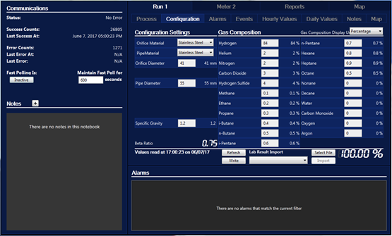 In addition to the Flow Computer Tags child tags, which read in all of the history and process data, the flow computer also collects configuration records. These configuration records, which include gas composition and pipe orifice details, are logged to the VTScada historian as a single entry by the Meter Run tag.