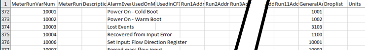 If you are entering a custom set of configuration addresses you will also need to provide the alarm/event message mapping. Many of the messages will be covered by the variables in the template; for example, if the orifice material is changed in one of the meter runs then the address passed back from the RTU will usually be one listed next to the 031_OrificeMaterial entry. However, some alarms/events are not associated with a particular meter run variable. These messages will need to be added explicitly, at the end of the configuration CSV. Some examples are shown in the following figure.