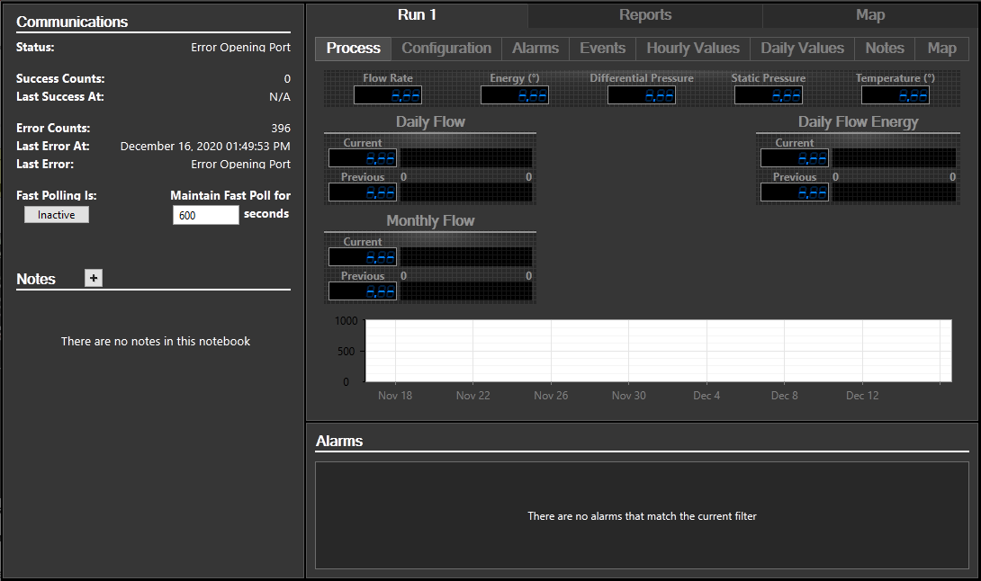 In the sample image at the beginning of this topic, the Run 1 tab is selected, showing the Meter Run component of the page. A tab will be available for each Meter Run within your Flow Meter. This display includes a number of tabs, as follows: