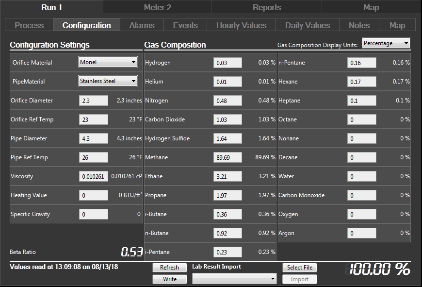 This figure shows a device configuration. Note that the gas Composition section MUST balance out to 100.00% before it can be written to the device. If not balanced, the “Write” button will not be enabled and the “Gas Total” value will display in orange instead of white as shown in the following example: