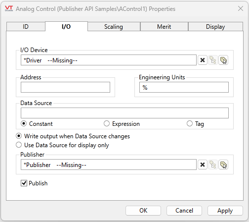 [Optional] While Analog Control tags usually take their value from an operator-controlled drawing object, the Data Source field provides the option of configuring this tag to accept a value from another tag or expression instead.