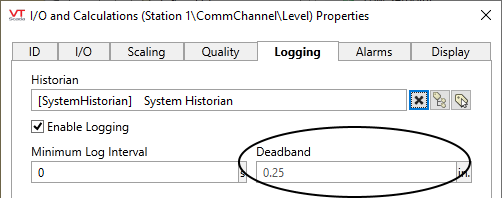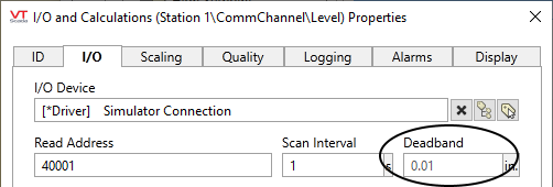 You are advised to note the deadband value on the I/O tab and the Logging tab of every tag you create. Adjust as required.