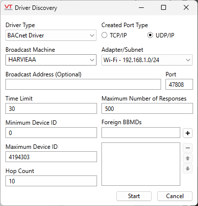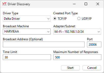 Configure the Driver Discovery dialog according to the device and location you want to search. Details may vary according to driver type. After configuring, press the Start button to begin the discovery process. A progress dialog will be displayed while the process is underway.