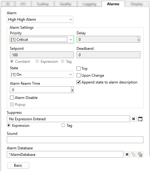 For Analog and Discrete, after switching to the advanced tab and making a configuration change, there is no option to switch back to the basic tab. If you use the advanced mode to do any alarm configuration, the basic option will no longer be available. If you close the properties dialog without doing advanced alarm configuration, then the basic tab will still be available the next time you open the dialog.