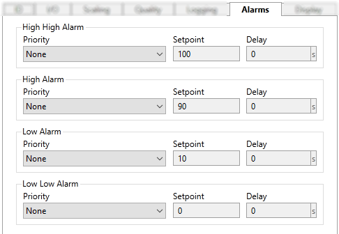 To avoid nuisance alarms due to transient spikes in value, set a delay in seconds. The tag's value must reach or pass the setpoint for this length of time before an alarm occurs.