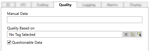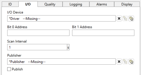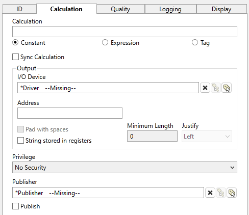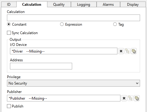 If an I/O and Calculation tag does not have a configured address (read, write or history) then it does not count against your tag license. This configuration can be valuable as a "memory tag", which holds a value that is provided by an operator via a widget. The data type can be Analog, Discrete, Digital, or String.