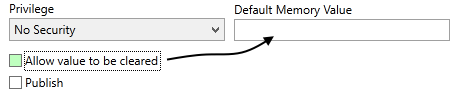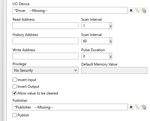 Because memory tags do not write to an address in hardware, it is possible to set their value to Invalid. This can be controlled with the option, "Allow value to be cleared", which is visible in the I/O tab only when no address has been configured. This option also affects certain widgets such as the Droplist Widget, which will show "No Data" (value: Invalid) only if the memory tag can have its value cleared.