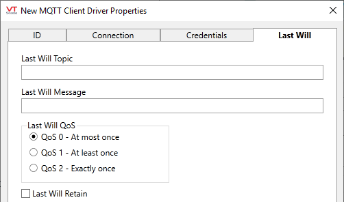 Specify the quality of service with which the Last Will should be sent. (See notes in the description of the Connection tab.)