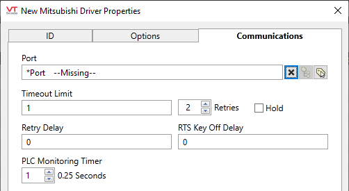 Mitsubishi Driver tag properties: Communications tab
