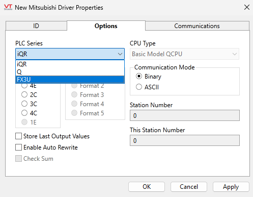 Mitsubishi Driver tag properties: Options tab