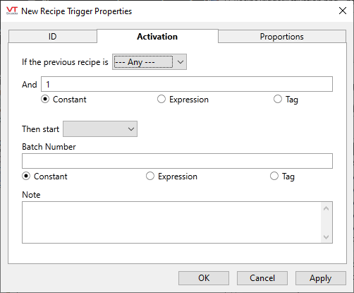 Triggers a Recipe Book to write the specified recipe to the PLC and to record it using the specified batch number and note. This tag must be a descendent of a Recipe Book tag. The trigger may be any of the following conditions: