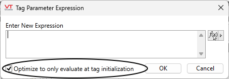 When using an expression to configure a parameter value, you can choose whether the value should be evaluated only when the tag starts (and re-starts), or whenever there is a change to any value used by the expression. Non-optimized tag expressions are intended for situations where configuration values must be obtained from equipment, which is reachable only after the application starts.