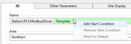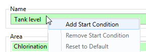 For all of the these actions, right-click on the parameter in the tag's configuration dialog. Your choices will vary depending on whether you add the expression to the name parameter (start conditions only), area parameter (which can inherit from its parent), and whether the tag is part of a user-defined type (where changes are considered overrides).