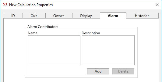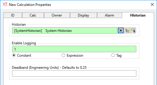 Note: in previous versions of VTScada, unlogged calculation tags could be plotted in the HDV, where the plot would start at the moment the tag was added to an HDV display and continue until the next restart. Such temporary logging is not possible if the Calculation tag has an attached logger because the values are now being permanently logged. Turning off the Enable Logging feature does not restore the previous behavior. If you have a use for only temporary logging, remove the Historian connection.