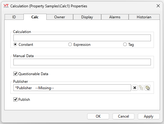 The Calc tab holds the expression for the calculation to be performed by this tag. While a choice of Constant, Expression or Tag is provided, you would normally use only Expression.
