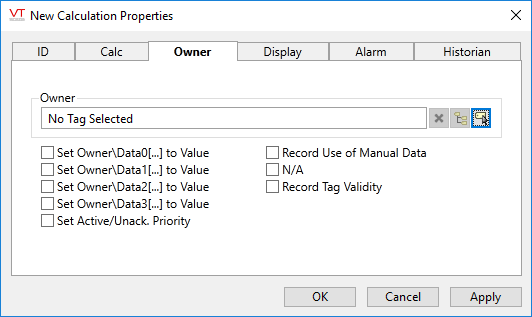 An owner tag may keep track of the quality of the data for each of its contributors. When selected, the Record Tag Quality check box is used to increment the owner tag's count of the number of tags that are contributing quality data by 1, and decrement this count by 1 when this contributor is not supplying quality data.