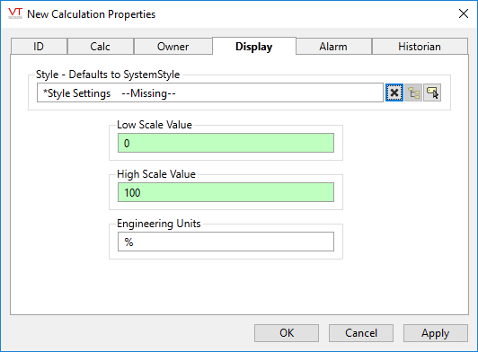 The default configuration will search for the first ancestor or then sibling tag of the Style Settings type. If there is none, it will use System Style, which is the default style tag that is automatically part of every new VTScada application.