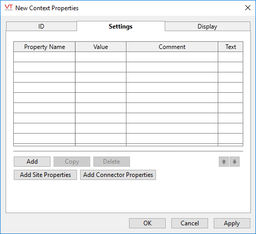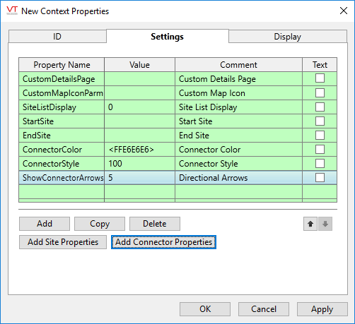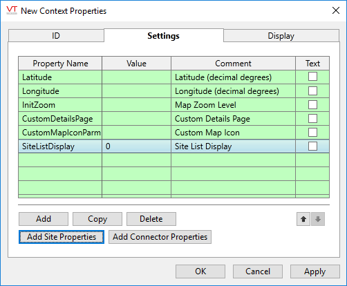 Site-related properties or Connector-related properties are most easily added by clicking the Add Site Parameters button in the Settings tab. After adding the properties you will find it easier to configure site or connector properties using the tools in the Site Display tab.