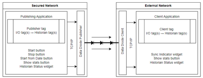 Your Data Diode configuration may resemble the above diagram. The publishing tags and widgets belong in a secured network. The data is transmitted out, to a client tag on the receiving application. There is no means to transmit data into the secured network, effectively isolating it.