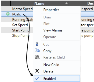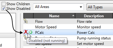Tags can be disabled automatically by use of a Start Tag Expression in the Name field. This is often used when building tag structures automatically. For example, you might create a lift station or well that can have one to four pumps. The tags for Pump 2, Pump 3 and Pump 4 would be configured so that they will be disabled in stations where they are not required. See: Design Your Own Tags.