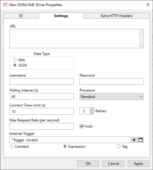 The name of a JSON/XML processor. Standard (the default processor) supports live values being read from the site, but does not provide support for timestamped historical data, forecast data, or dynamic data where the payload structure can change. For these cases, you can write your own processor that will handle complex data structures. See: Write a JSON/XML Processor