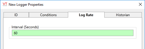 The Log Rate tab of the Logger tag properties folder is used to identify the rate at which the data is recorded for the monitored tag. Intervals start at midnight. An interval of 86400 (seconds in a day) would write a value once at the end of each day.