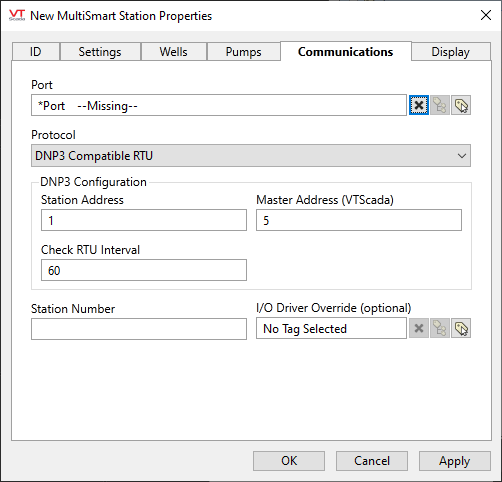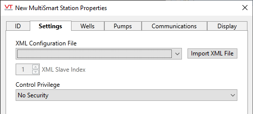 A single MultiSmart Station tag includes all of the I/O required to monitor and operate a MultiSmart pumping station. Configuration is done in part through the standard set of VTScada tag configuration panels and in part through a MultiTrode-supplied XML file that describes your equipment. File names to look for are as follows: