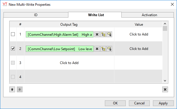 The Write List displays the output or memory tags that will be written to, and controls what value will be written to each. The outputs will be written in the order in which they are displayed.