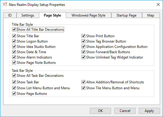The Page Style tab includes settings that apply to VIC sessions that display in Full Screen Mode (as set on the Settings tab). This is a list of which elements of both the Title Bar and the Task Bar you wish to make visible.