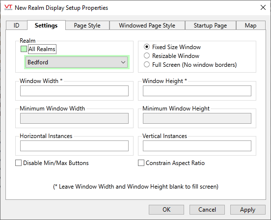 You also have the option of making the settings apply to all realms that include this application, rather than just one at a time. To decide whether to use that option, you must choose whether you want to provide different settings to different VIC stations - which would be done via different realms. Changes to this tag take effect immediately. There is no need to restart the application after adding or changing a Realm Display Setup tag.
