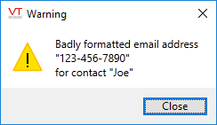 If an operator’s contact mode has been set to email and a badly formatted email address has been entered, then the following warning dialog will be displayed:
