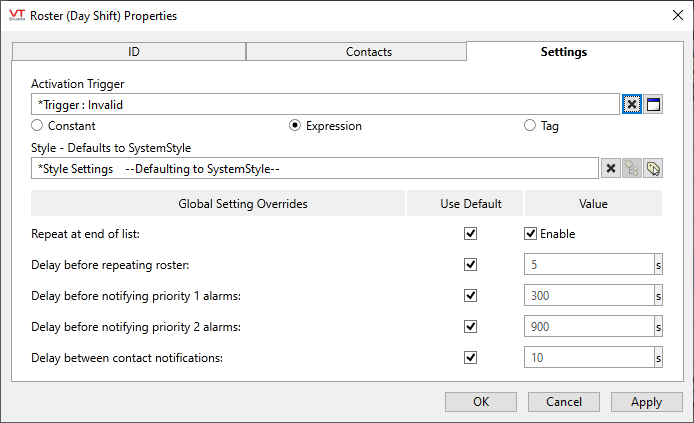 The Area field, selected during configuration, is especially important for Roster tags. The Area field is used by VTScada to link the Roster to alarms with the same area. If more than one Roster shares the an area, only one can be active at a time. The active Roster Tag in an area is always the one most recently activated - all other Roster tags with the same area property are automatically deactivated when one is activated. (See: Roster Selection Hierarchy)