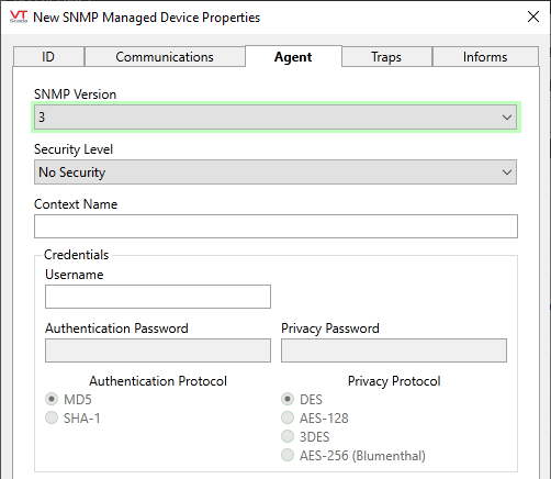 When using version 3, authentication may be done using either HMAC-SHA-96 or the MD5 protocol. Encryption uses either DES or 128-bit AES(1). Choice of protocol is done using the following application properties, found in Settings.Dynamic: