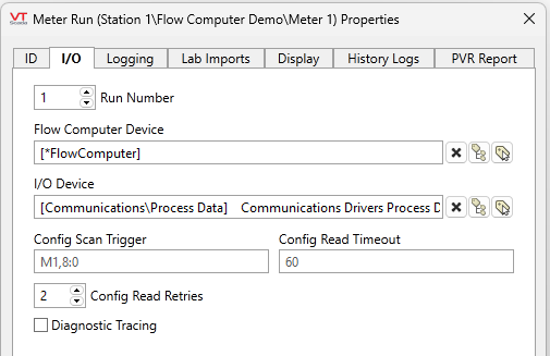 Process Volume Report Report Tab is used to assign a PVR Report Definition and one or more PVR Report Entity tags to the Meter Runs tag.