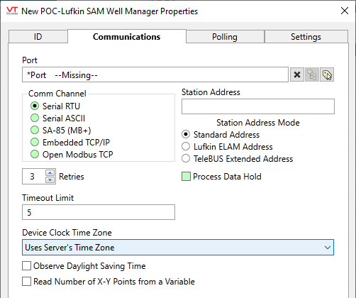 POC-Lufkin SAM Well Manager properties Communications tab
