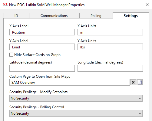 POC-Lufkin SAM Well Manager properties Settings tab